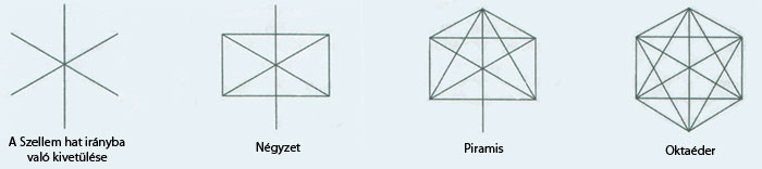 Tehát a szellem hat irányban vetítette ki magát. Következő lépésként összekötötte a vonalakat — először négyzetet formált, majd egy gúlát, majd a vonalak tovább húzásával alul is kialakult egy gúla, így vált láthatóvá egy oktaéder. Így a szellemet egy oktaéder valósága Vette körbe. Bár csupán mentális képről beszélünk, a mozgás immáron lehetségessé vált, mivel az idomok kerületei már megalapozottá váltak.