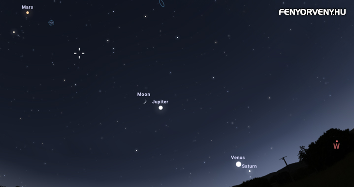 23-án hármas találkozó lesz. 17:15 körül a Vénusz–Szaturnusz még mindig látható lesz egymás mellett, az 5%-os holdsarló pedig hármas együttállássá alakítja az égi jelenséget.
