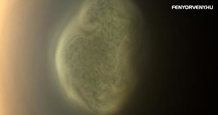 Először ez a 2012-ben készült felvétel utalt a Titan déli pólusának környezetében elkezdődött változásokra. A Cassini kamerája által megörökített impozáns felhő körülbelül 300 kilométer magasságban lebeg a hold légkörében. Most egy ennél is nagyobb képződményt detektált a szonda infravörös spektrométere. (NASA/JPL-Caltech/Space Science Institute)