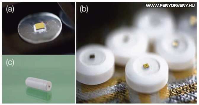 (a) A szenzor közelről (b) A szenzor egy tablettán elhelyezve (c) A szenzor egy kapszulában (Credit: Proteus Digital Health / fenti kép)