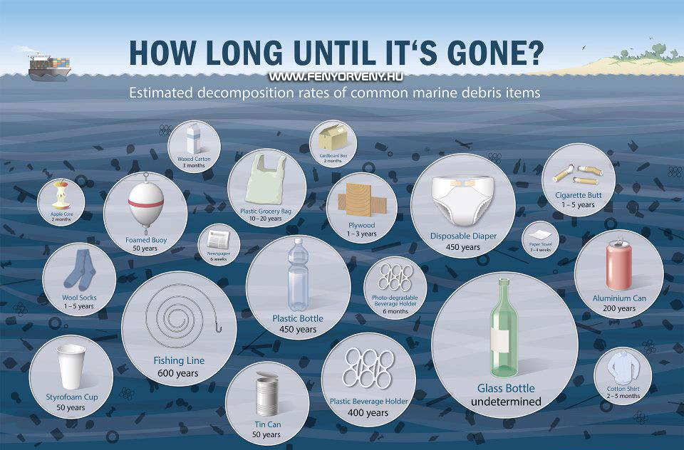 Egy nagyon érdekes grafika, amely megmutatja, hogy a különböző fajta hulladékoknak mennyi idő kell a lebomláshoz. Elgondolkodtató!