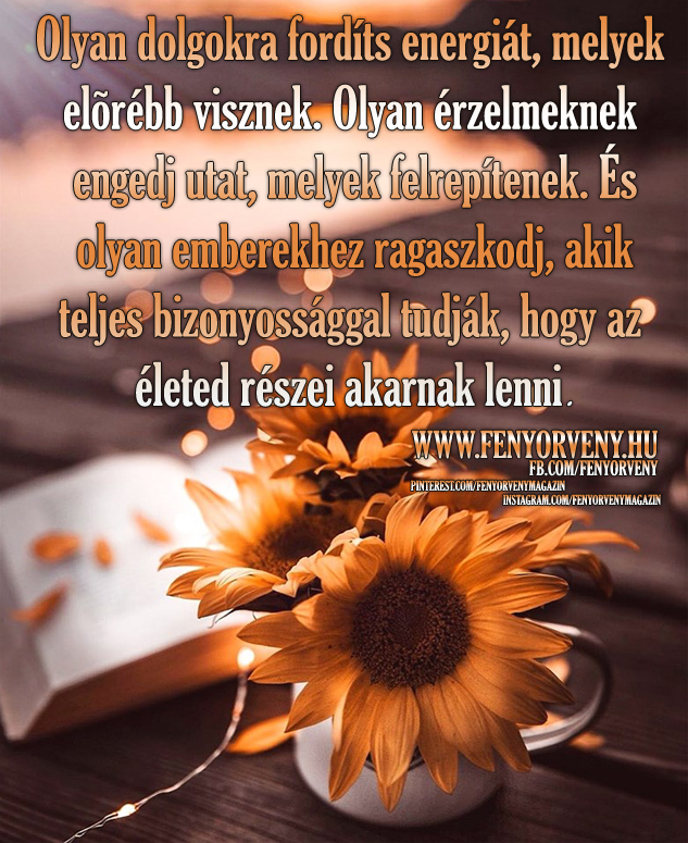 Olyan dolgokra fordíts energiát, melyek előrébb visznek. Olyan érzelmeknek engedj utat, melyek felrepítenek. És olyan emberekhez ragaszkodj, akik teljes bizonyossággal tudják, hogy az életed részei akarnak lenni.