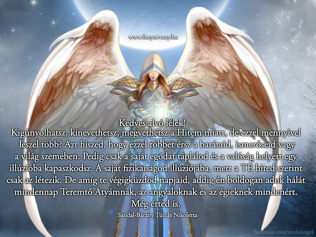 Kigúnyolhatsz, kinevethetsz, megvethetsz a Hitem miatt, de ezzel mennyivel leszel több? Azt hiszed, hogy ezzel többet érsz a barátaid, ismerőseid vagy a világ szemében. Pedig csak a saját egódat táplálod és a valóság helyett egy illúzióba kapaszkodsz. A saját fizikaiságod illúziójába, mert a TE hited szerint csak az létezik. De amíg te végigküzdöd napjaid, addig én boldogan adok hálát mindennap Teremtő Atyámnak, az angyaloknak és az égieknek mindenért. Még érted is.